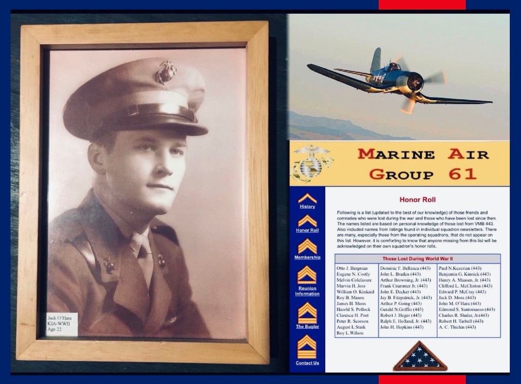 O’HARA, John M., 1st Lieutenant, USMCR. Parents, Mr. and Mrs. James O’Hara, 17175 Muirland Ave., Detroit, Mich (na) + O’HARA, John Martin, 24846, VMB443, MAG61, 1stMAW, New Hanover Island, September 11, 1944, killed in action (mc)