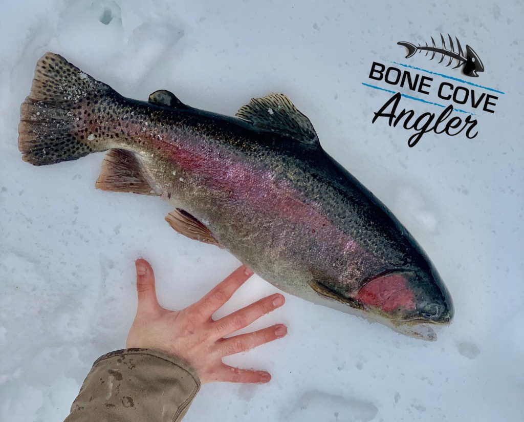 Trophy Winter Rainbow! Holy Cow!!! Share this: Bone Cove Angler Share on X (Opens in new window) X Share on Facebook (Opens in new window) Facebook Share on LinkedIn (Opens in new window) LinkedIn Email a link to a friend (Opens in new window) Email Like Loading...